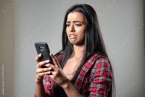 Select from premium Disgusted Phone of the highest quality. Photo about Anxcios young girl looking at phone seeing bad news or photos there with disgusting emotion on her face.